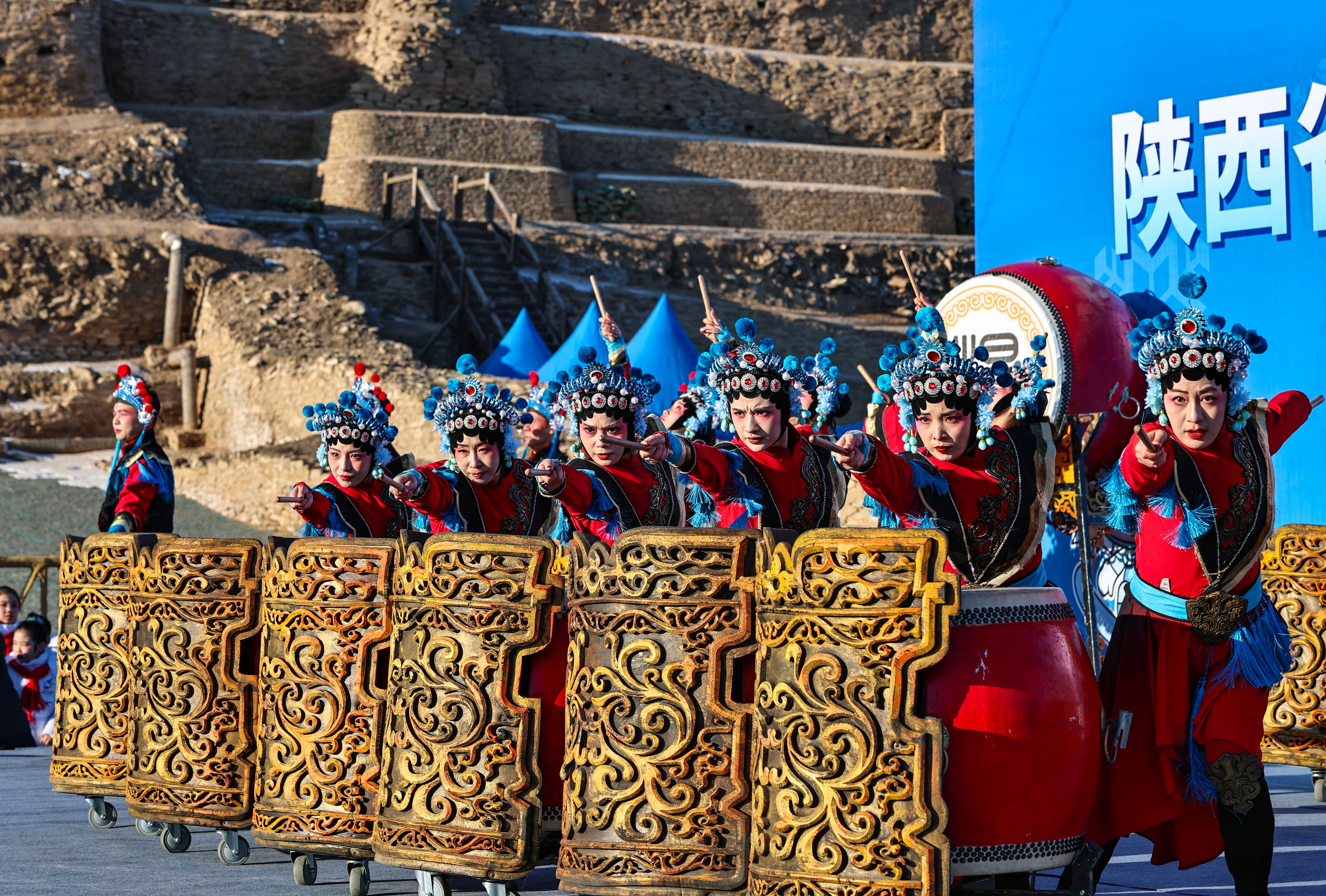 仪式在《逐梦冰雪 陕耀未来》暖场展演中拉开序幕。杨家鼓铿锵激昂,再现千年忠勇风骨;朗诵《薪火·光耀神州》诠释石峁文明厚重肌理;陕北民歌联唱《星火·燎原塞上》唱响三秦儿女赤诚;舞蹈《热火·冰雪激情》《采火·共赴未来》点燃冰雪运动热情,将传统文化与体育精神深度融合。