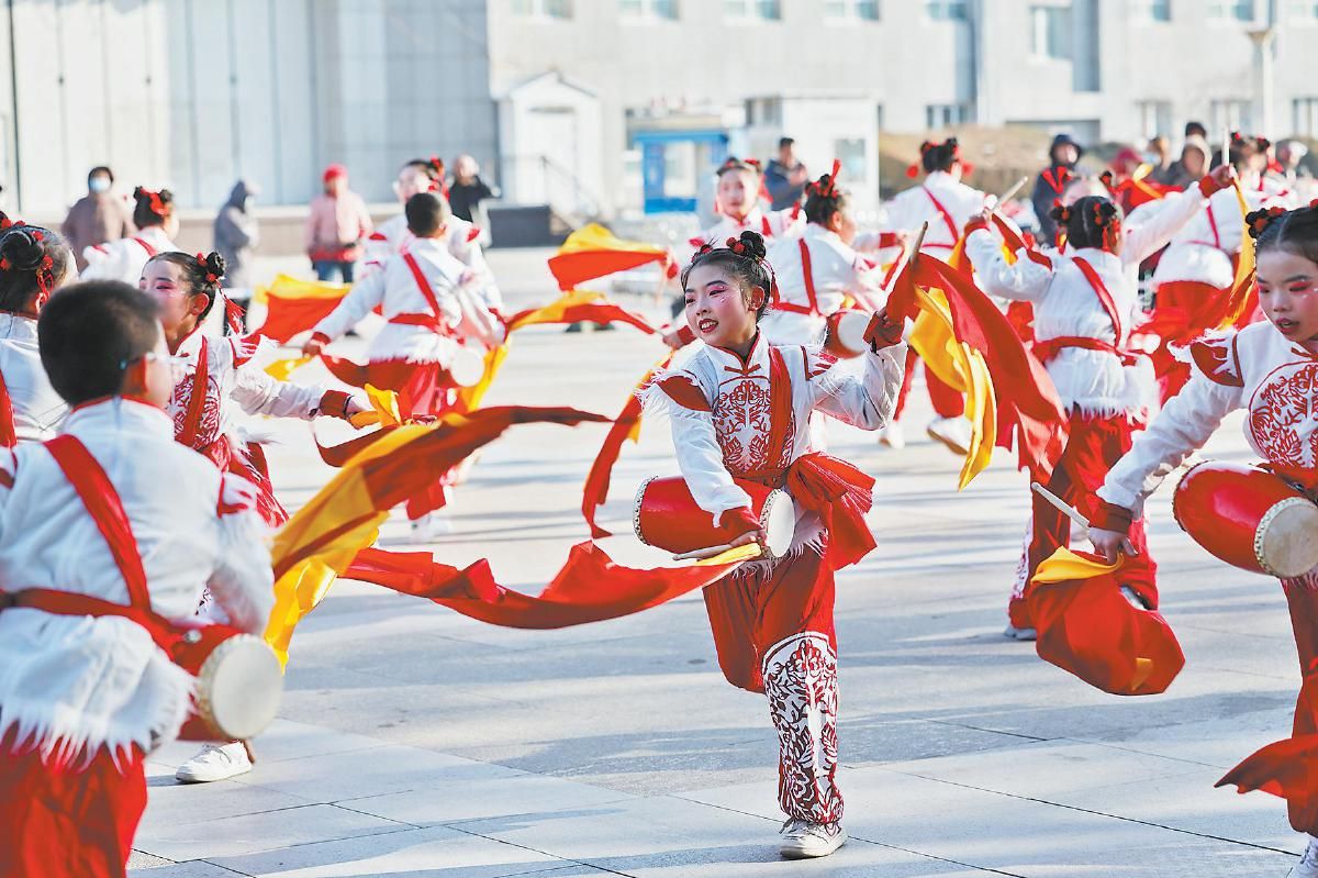 小朋友表演陕北腰鼓,为火炬手加油。