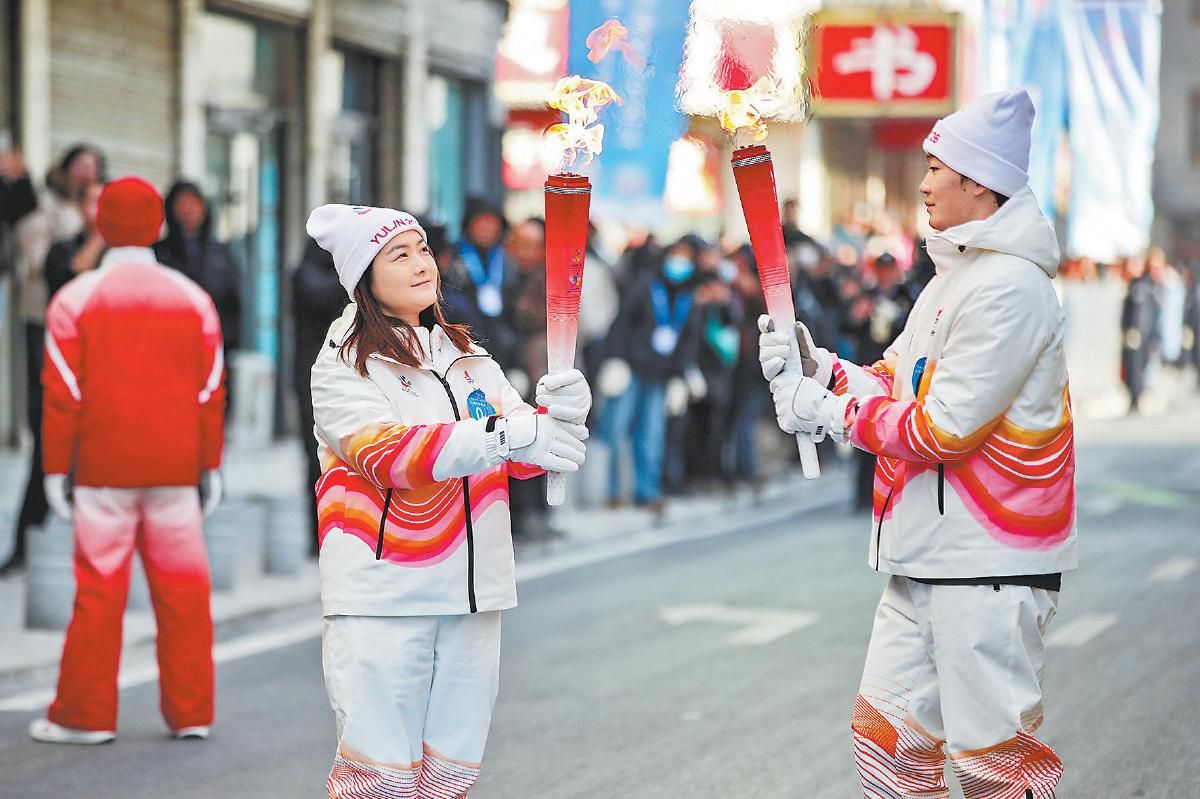 在省一冬会火炬传递绥德站活动中,两名火炬手在交接火炬(1月13日摄)。 记者 杨彬 摄