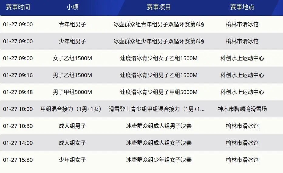 1月27日,陕西省第一届冬季运动会冰壶群众组将迎来青年组、少年组的系列赛事,特别是少年组女子决赛激情上演;与此同时,速度滑冰青少年组比赛及滑雪登山青少组混合接力赛也将火热进行,让我们一起期待。