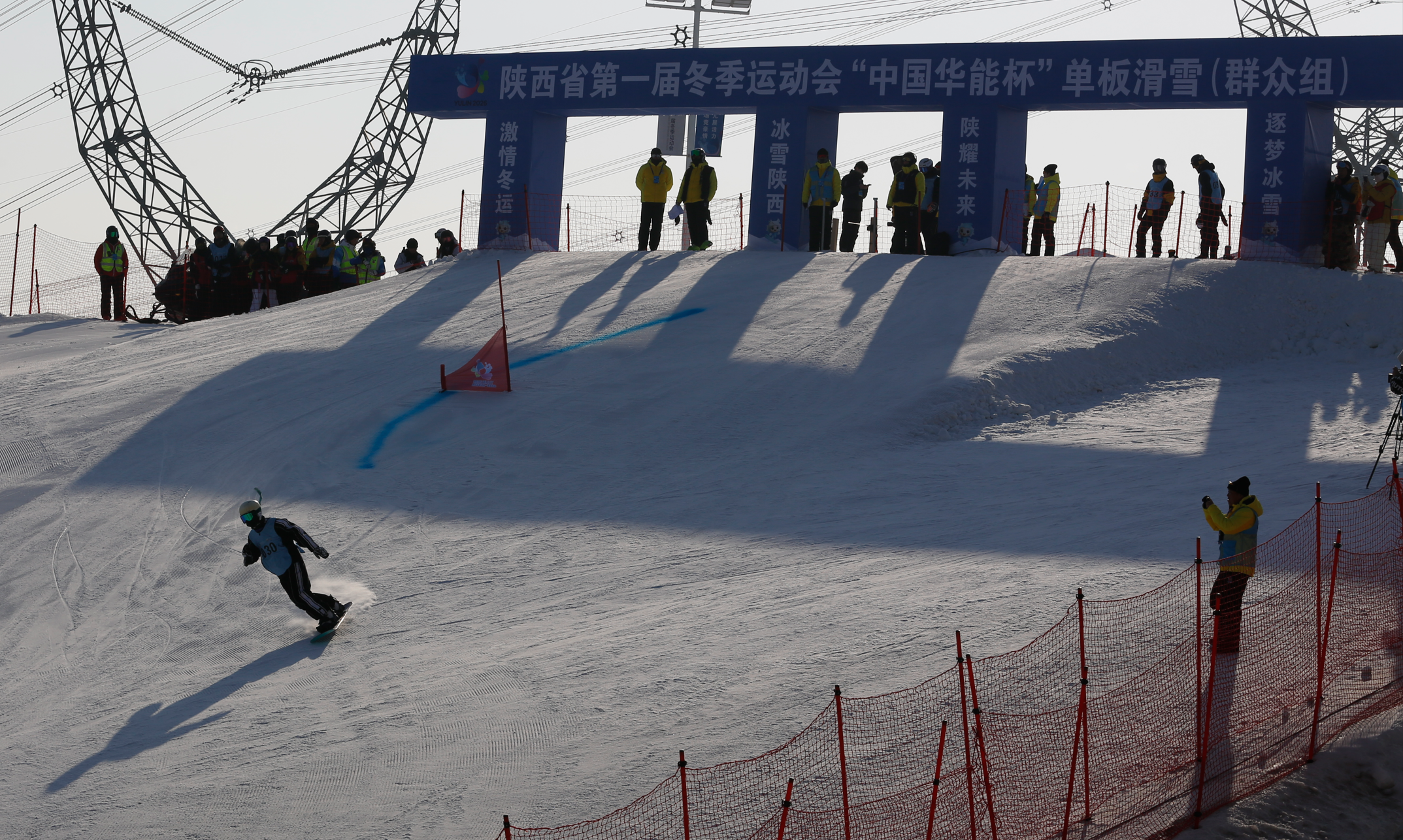 雪板扬起冰晶,身影划破寒风。1月30日,陕西省第一届冬季运动会“中国华能杯”群众组单板滑雪平行大回转(大学生组)比赛在神木碧麟湾滑雪场展开角逐。来自全省的10支大学生队伍在此竞逐,用速度与技巧,在雪道上演绎了一场力与美的冰雪较量。