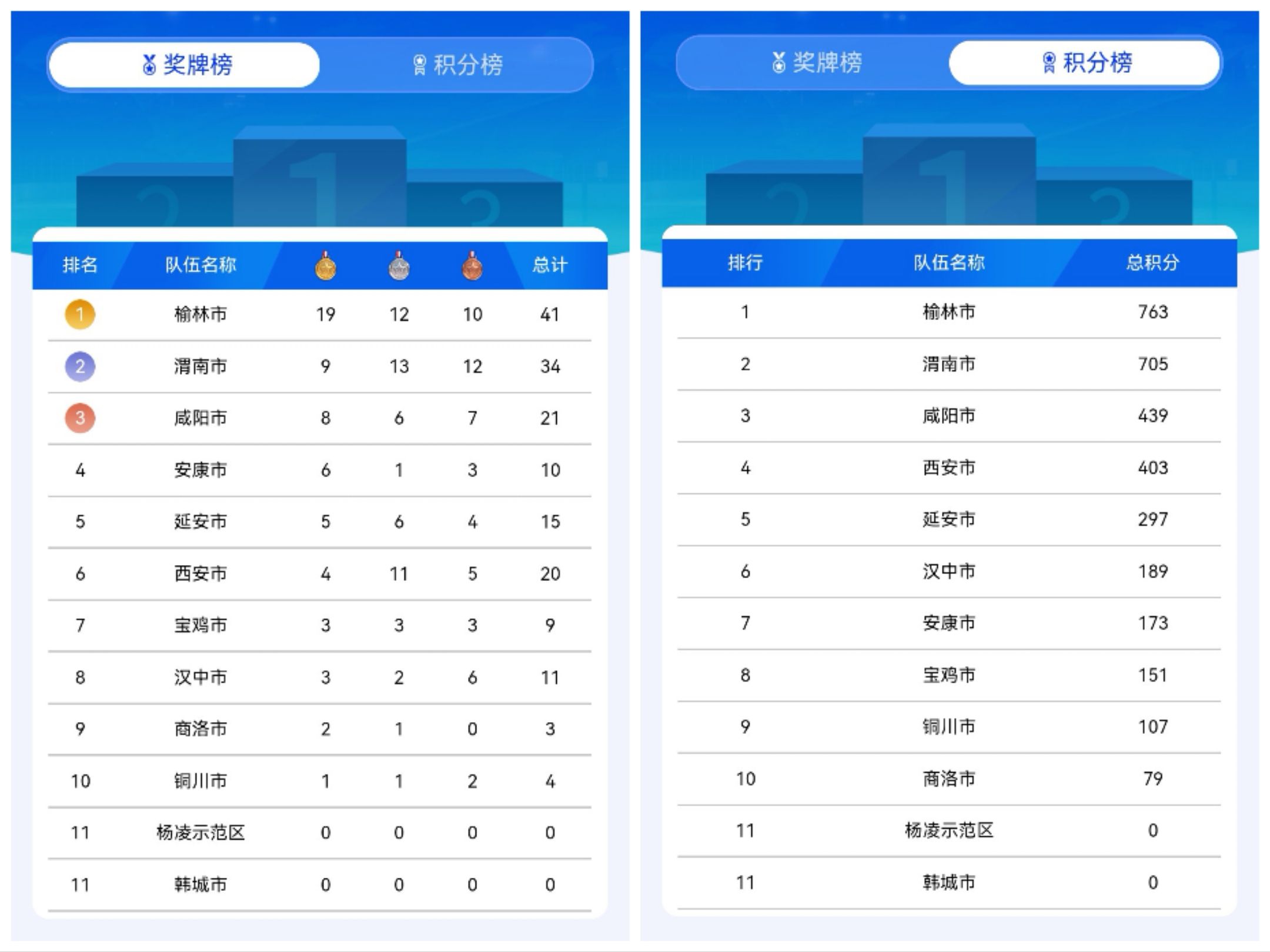 榆林市以19金12银10铜的绝对优势暂居榜首,总分763一骑绝尘;渭南市以9金13银12铜紧随其后,总分705紧追不舍。