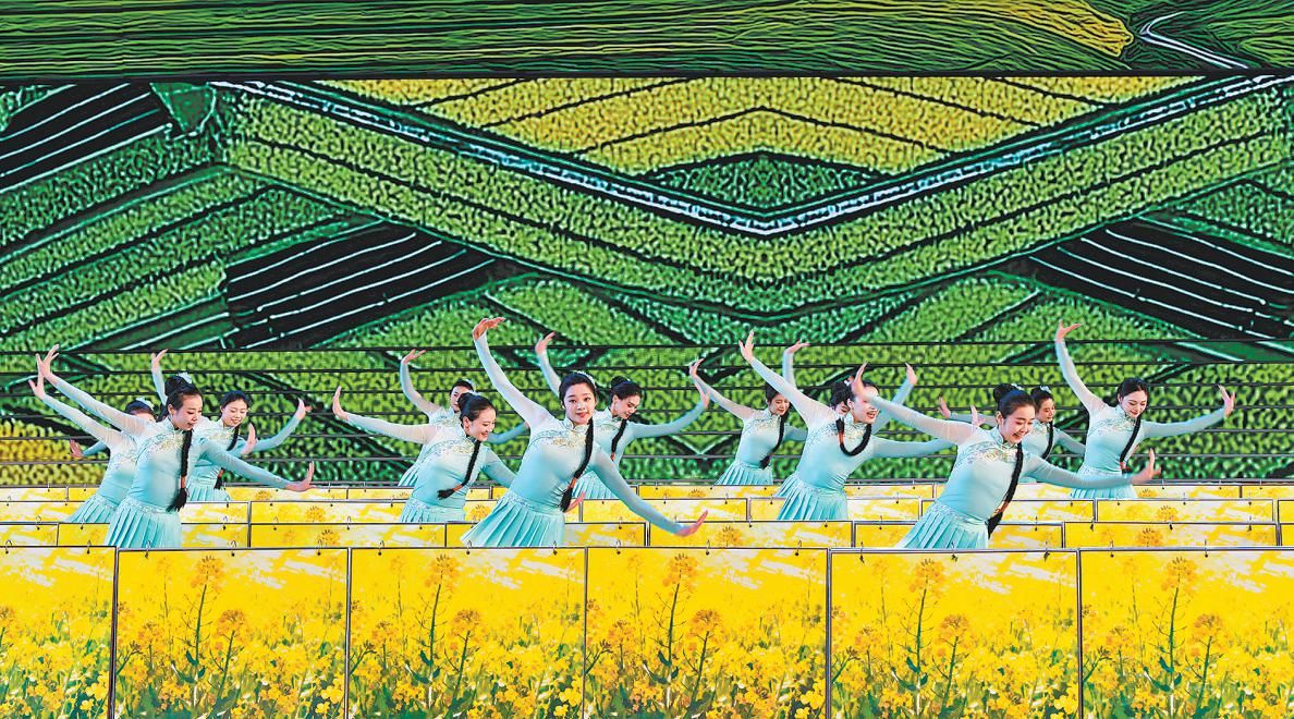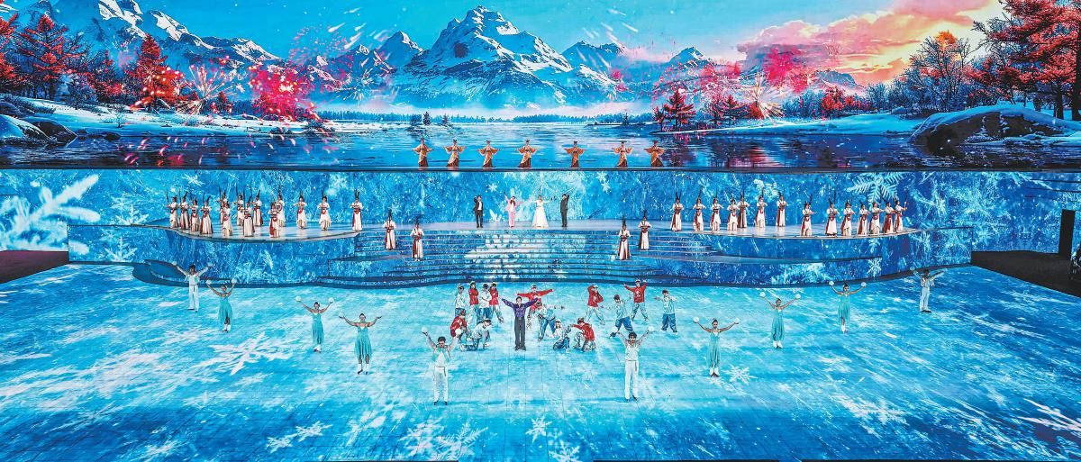 《九曲冰腾》以黄河冰凌映照历史新篇,从古老舟楫驶向时代航船,见证三秦大地拥抱“一带一路”的开放格局,踏上陕西联通世界的崭新征程。《山水向荣》天地如卷,山河如画,勾勒出陕南的灵秀、陕北的辽阔、关中的丰饶。冰雪经济与生态农业交融共鸣,谱写出乡村振兴的美丽和声。《同心织梦》以志愿微光,织就大爱榆林。以路生梅为代表的无数扎根奉献的身影,让“志愿”二字在冰雪赛场、在三秦大地上“长”成了动人的风景。《雪盼桃华》当最后一抹雪色融入大地,暖风便捎来了桃枝舒展的消息。这不仅是季节优雅的转身,更是这片土地积蓄了整个冬天的生命力,在春风中翩然起舞的宣言。《追赶超越》在伟大旗帜的引领下,三秦儿女凝聚起阔步新征程的磅礴力量,朝着中华民族伟大复兴的宏伟目标奋勇前行。