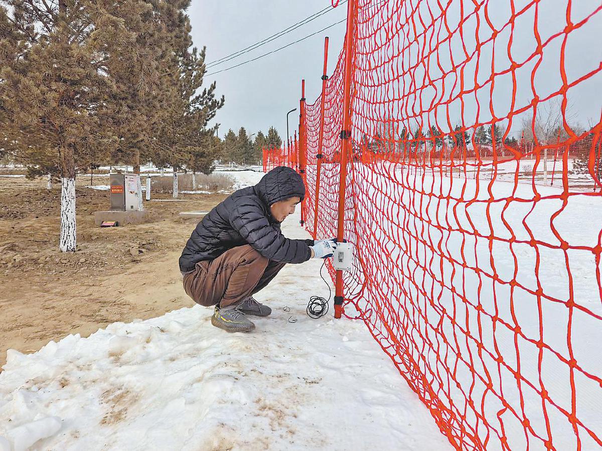 气象保障服务人员在科创新城望桩梁滑雪场安装红外雪温冰温测量仪。