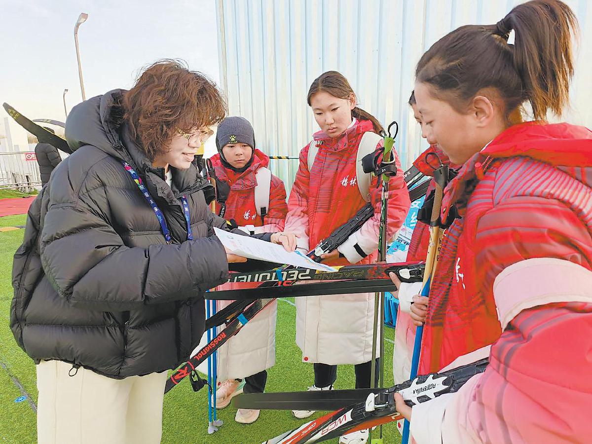 气象保障服务人员向越野滑雪运动员介绍天气情况。