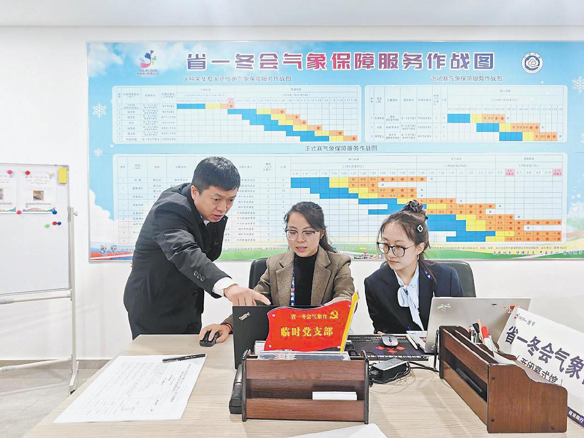省一冬会气象台在开幕式现场讨论制作最新一期气象专报。